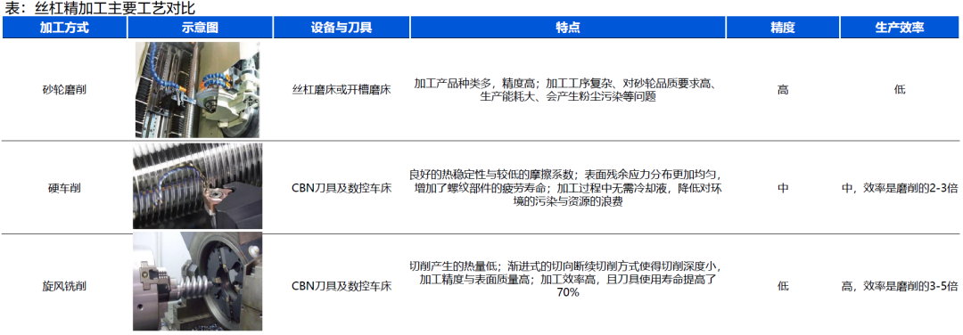 硬车:又称之为以车代磨,其采用螺纹滚道硬车削技术,最大优势是避免在磨削粗加工螺纹滚道过程中,因切削热导致丝杠硬度降低而引起可靠性差问题的发生,并且加工效率高,无油烟粉尘污染、绿色环保。对应的设备为车床。