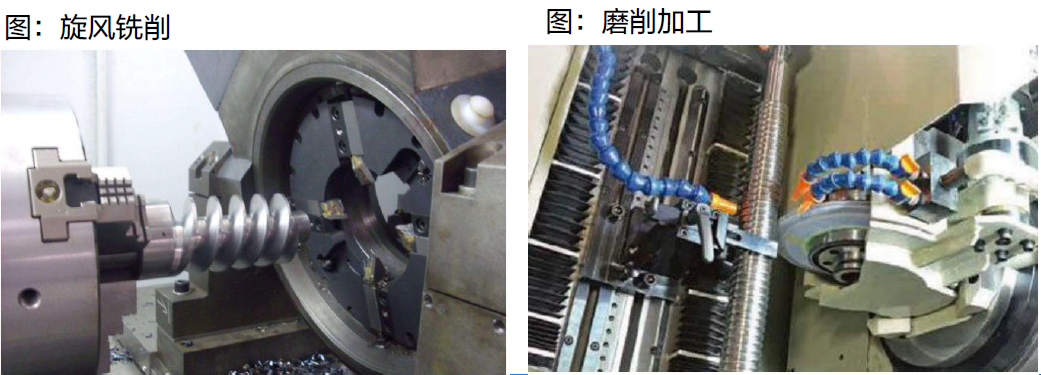 旋风铣:旋风铣削是通过工件与刀具的旋转组合来执行加工,优点是将螺纹滚道一次成形铣削,减少了工序,而且不必反复修整刀具和校直,加工效率大幅提升,加工精度等级可以达到P3级。对应的设备为旋风铣床。